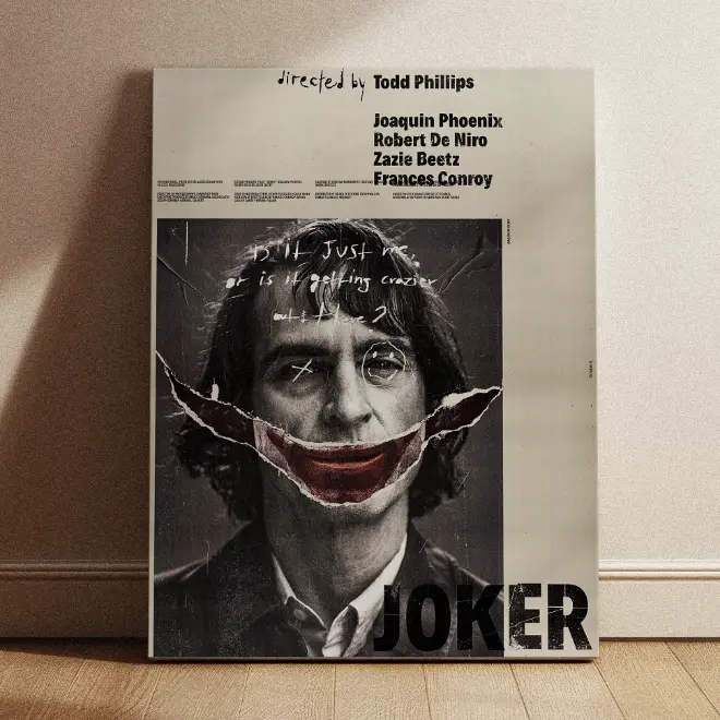 Tags: cinematic posters, comic-inspired wall art, dark theme decor, DC movie decor, fan-favorite wall art, joker movie poster, Joker wall art, modern poster prints, Tinopia collection, unique movie posters
